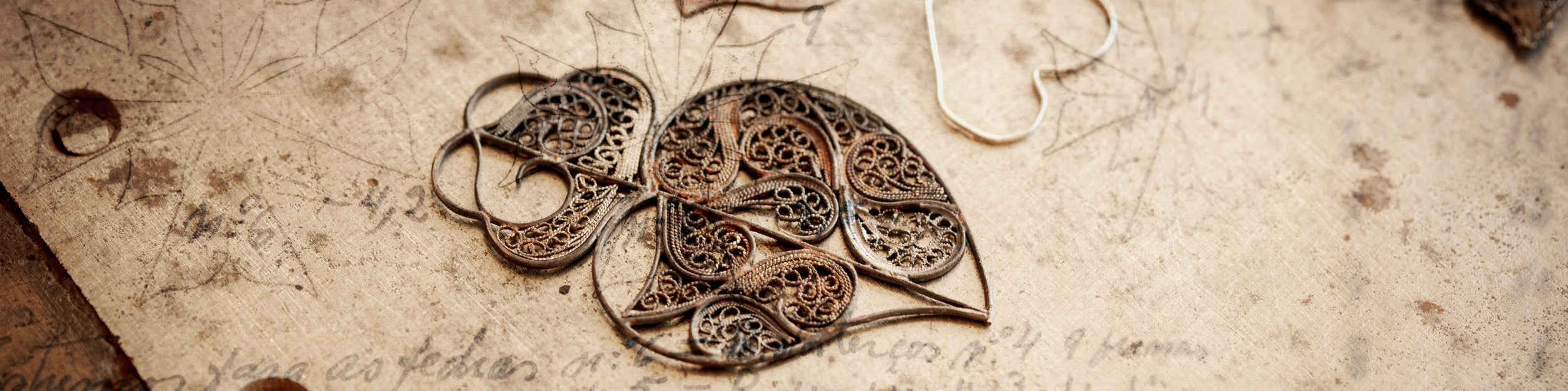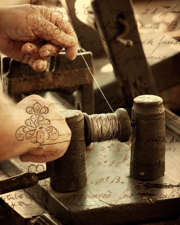 The word filigree derives from the Latin filum + granum. The term refers to the granulated gold thread obtained from the twisting of two threads, no thicker than a hair, which is then beaten. The process gives the thread an unmistakable texture, characteristic of Portuguese filigree.
